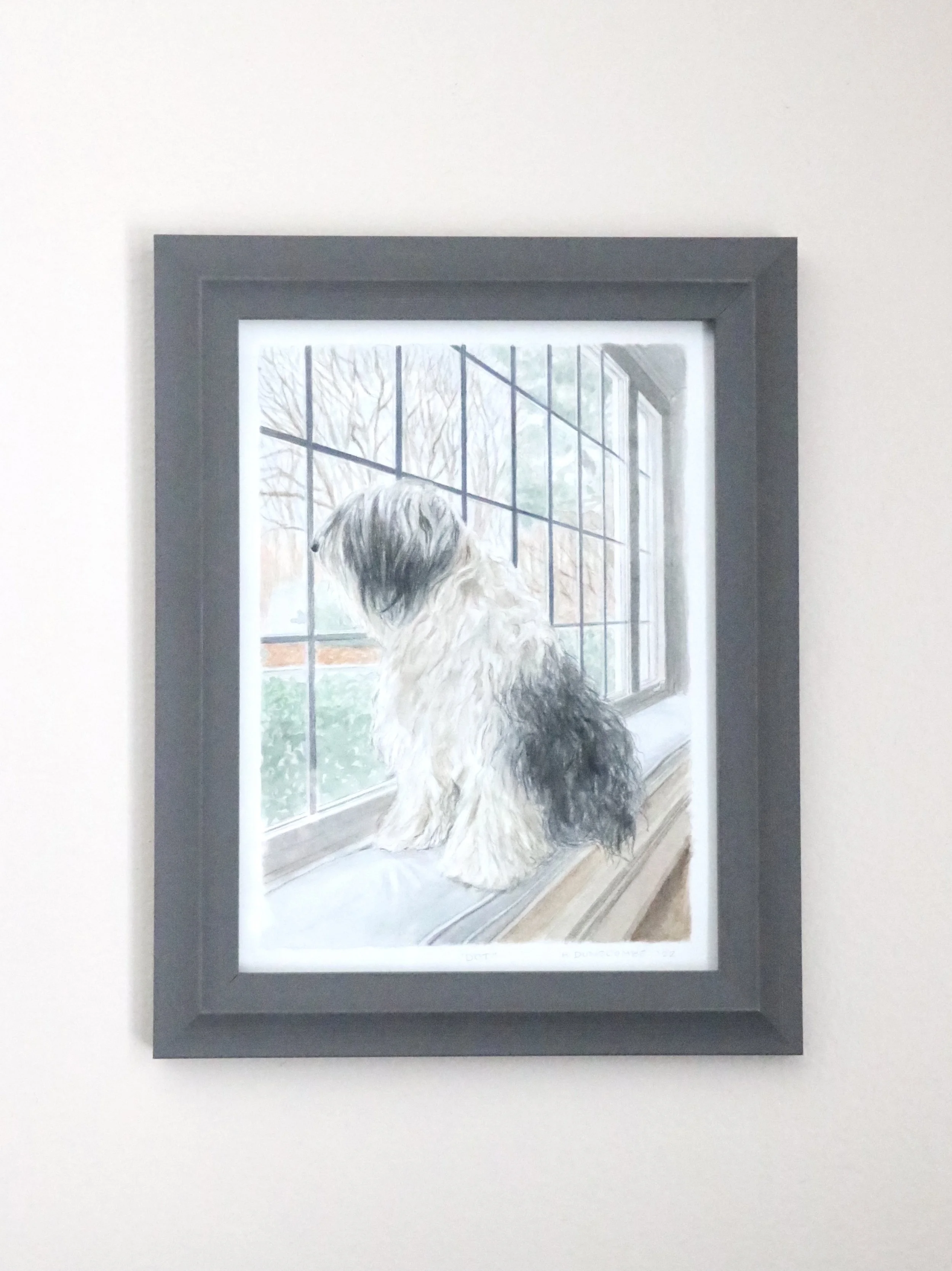 This adorable pup is Dot! This commission came in through way of Ripley’s extended family. It was a lot of fun putting together the background (I used a lot of blendable colored pencils to get the sharpness of the window frame), and of course Dot’s fur has so much great texture and soft colors. Lately I’ve been going for a small square-head brush for fur; it just gives it some nice glisten and doesn’t allow for too much preciousness (eyelash-thin brushes can quickly make fur look hyper-realistic in my experience). I was thinking of doing a classic wooden frame because I feel like a medium wood complements pretty much everything. But then saw this lovely gray frame that really set off Dot’s fur.