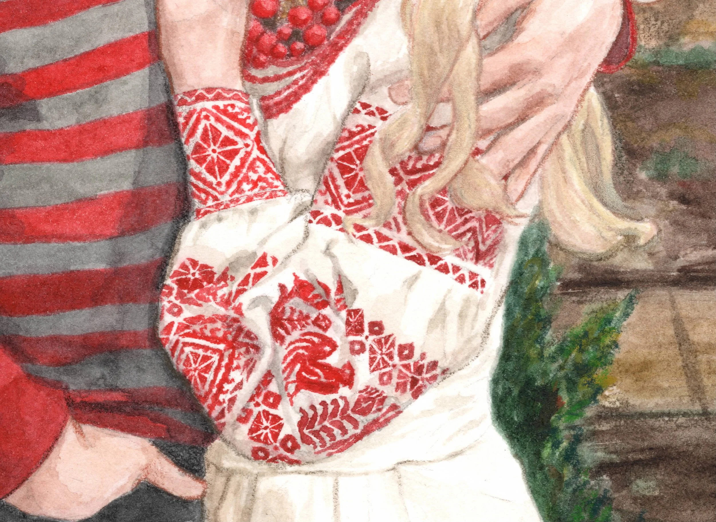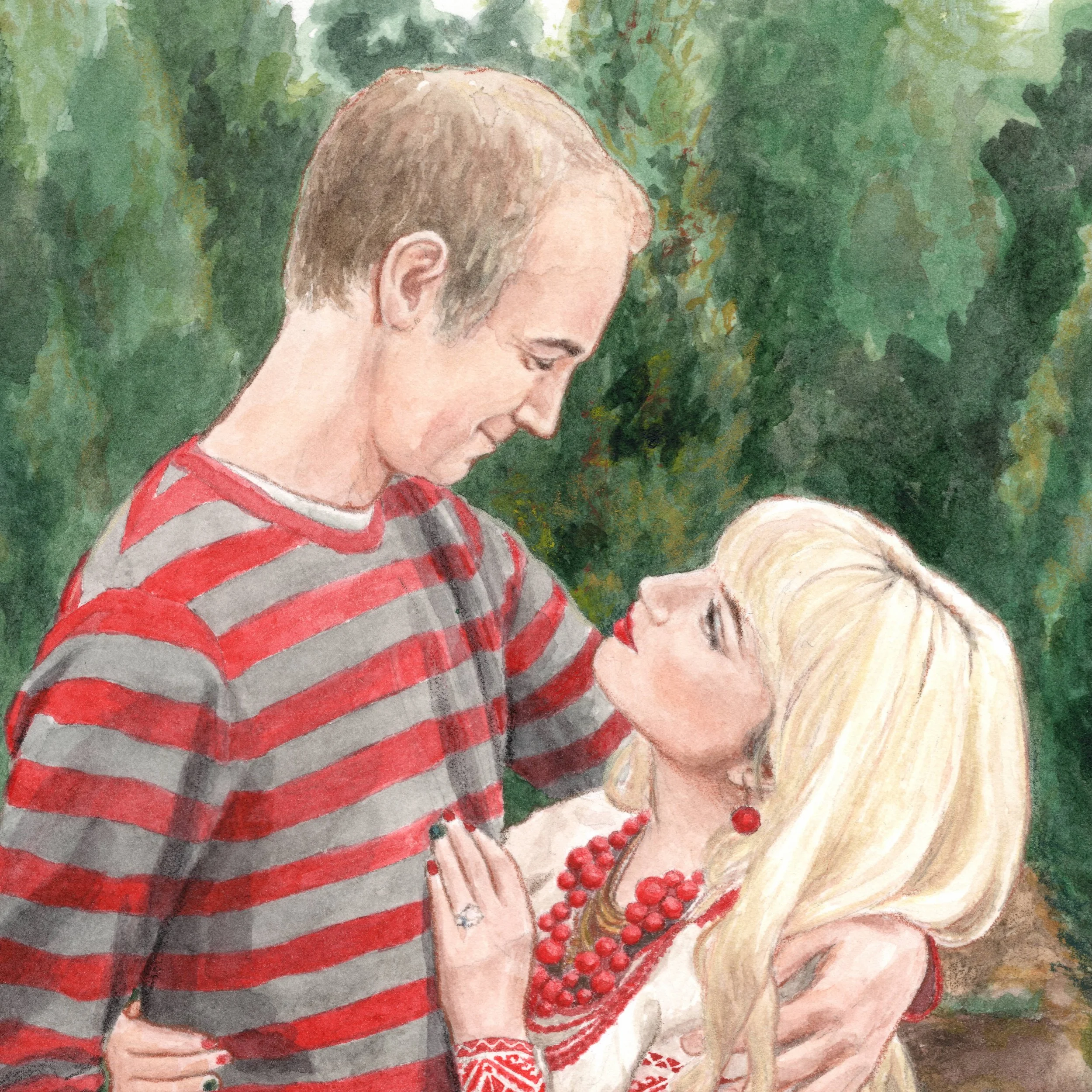 This portrait is based on Emily and Derek’s engagement photos and was a gift for their wedding. I really loved working on all of the beads and the embroidery on Emily’s vyshyvanka. Plus, it’s always nice to paint people you know.