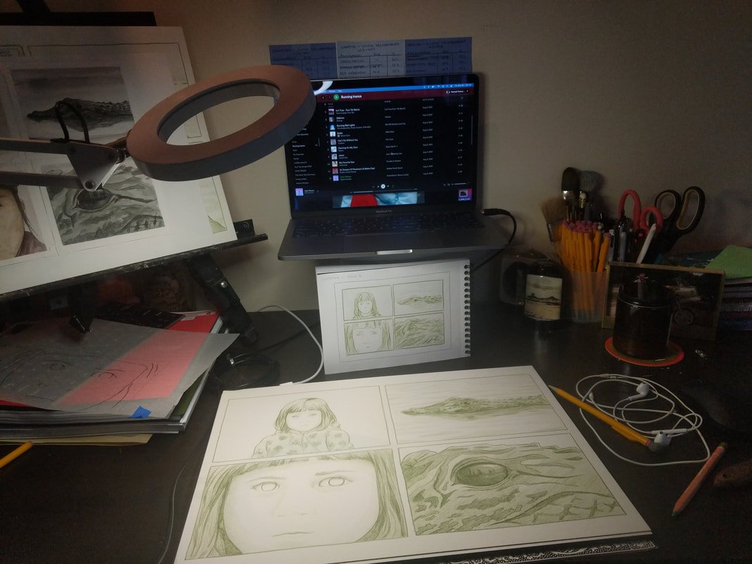 I purchased a few sketchbooks that were on sale last month and have been using those to develop thumbnails in their final coloring too, so I can get a sense of flow and refine composition. I was previously doing thumbnails only in graphite with multiple pages on a big sketchbook page and wasn't really thinking about layout much, so blowing them up channels more of that awareness. I went through and numbered the pages and have certain sections for specific chapters, so as I'm writing, if I need to figure out a layout I have a place to work that will fall in line chronologically.
