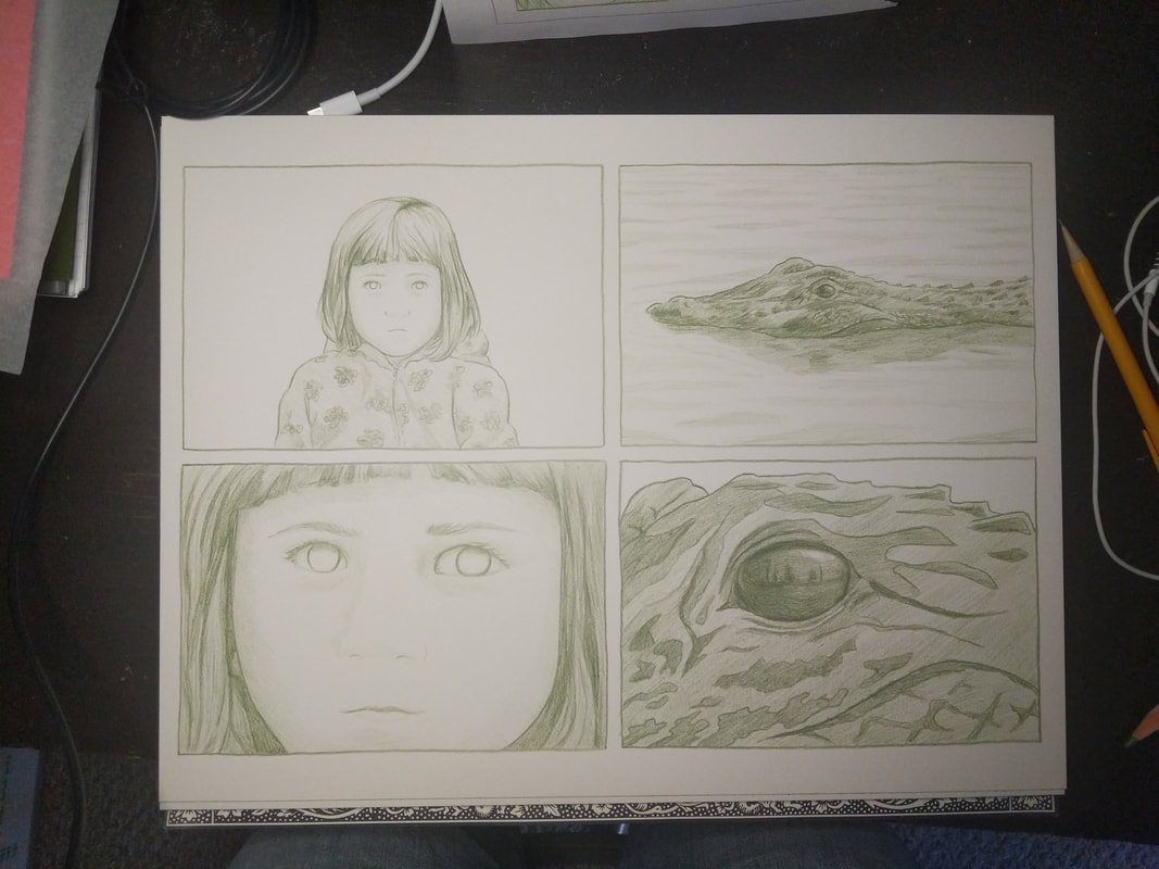 I spent a lot of time in the summer working on the typed script and developing graphic novel thumbnails for the chapters that are still a little fuzzy, which was helpful but also never quite brings the same satisfaction as cranking out pages. I started another page in chapter one the day before yesterday and just wrapped it up this morning; it's one of my favorites of three-year-old me staring down an alligator. It's a lot of fun to be reworking the original chapter that I had started with, having learned a whole lot about the style I'm looking for and what I'd like to convey. I had done this chapter in pen and watercolor well before the graphic novel workshop in 2019 and I feel like I'm looking through a telescope at the old pages trying to recall my headspace. Some of them are over three years old and it was well before Grandma Rose's death.