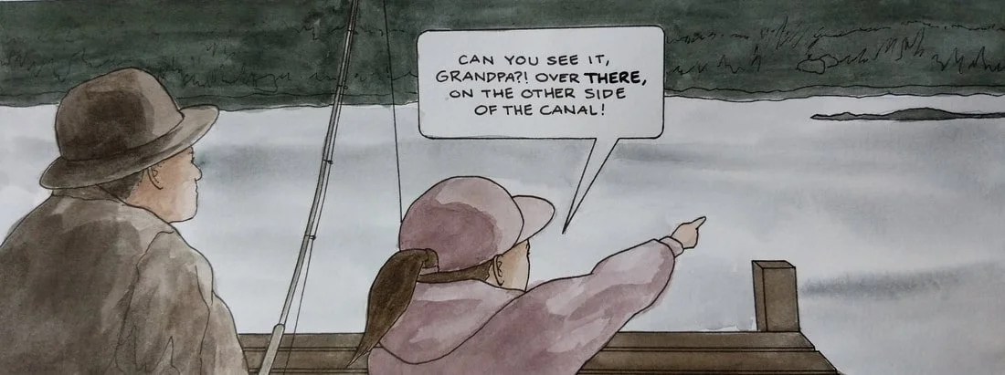 My last day of work was on the 16th, and I just had my first week completely left to my own devices! I'm trying to get a lot of the important stuff out of the way first: registering for classes and submitting grad school paper work, signing up for Mass Health, doing a deep clean of the apartment and donating things we don't need, planning a couple of family visits coming up, and doing some thinking about wedding plans. But I did reserve a day last week to get back on the saddle with drawing. It felt great! I'm now returning to the fishing scene I had started with back in 2017. Comparing these two panels, can you see a bit of growth? The one on the right I photographed in 2018. I feel like I've learned so much in terms of style, composition, and inventing images out of my head.